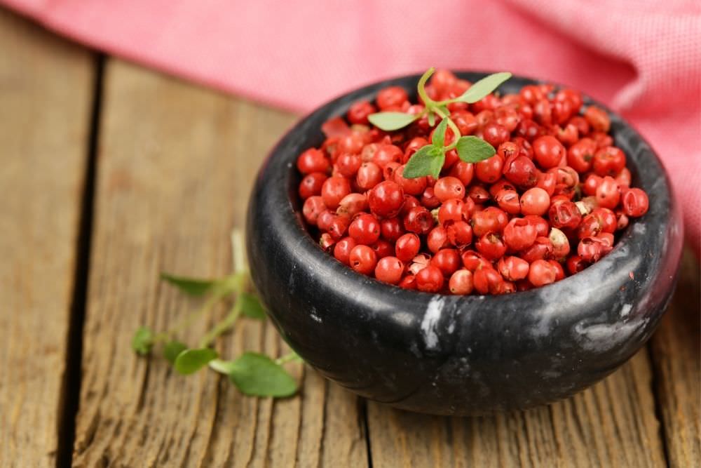 粉紅胡椒主要產地位於巴西、祕魯,如同黑胡椒般的溫暖又辛辣,又不同黑胡椒,有著新鮮舒爽的香氣,並帶有清淡的乾燥木質香調,只要在調香時少量添加,就有顯著效果。舒展的香味層次,令人暢快爽朗。