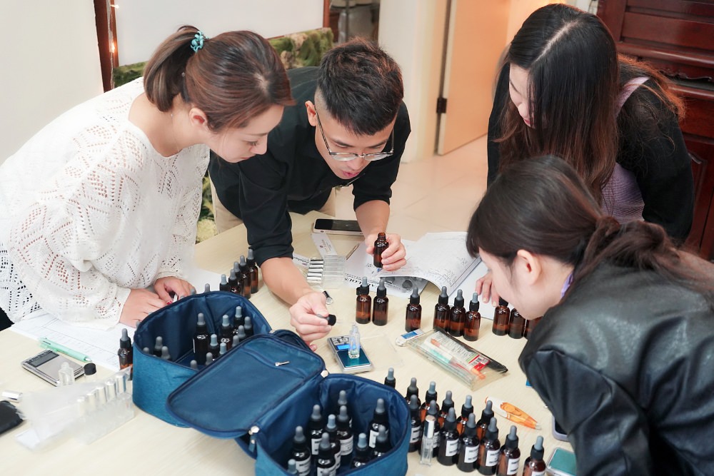 不過,就像廚師一樣,考到證照後,即便可以經營餐館,但對味道的敏感度與廚藝都還要再精進。學完調香並不是終點,說白話點,一個調香師在遇到一款新上市的香水,他可以在不知道配方的情況下,分辨出幾十種香料,那是因為專業的調香師,他需要具備能夠分辨幾千種香料的能力,也就是嗅覺靈敏度要夠強,而這也是我們高階調香師培訓課程裡的重點。